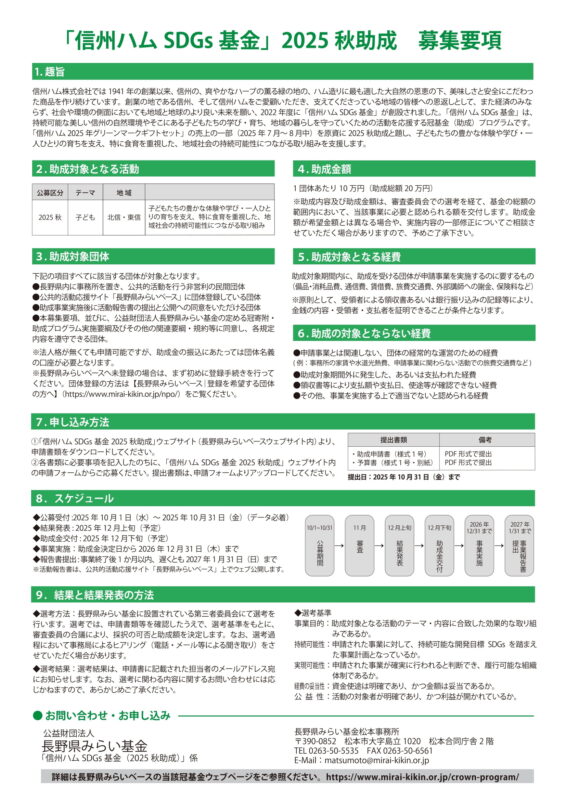 下記「信州ハムSDGs基金2025秋助成」を開いてご確認ください。