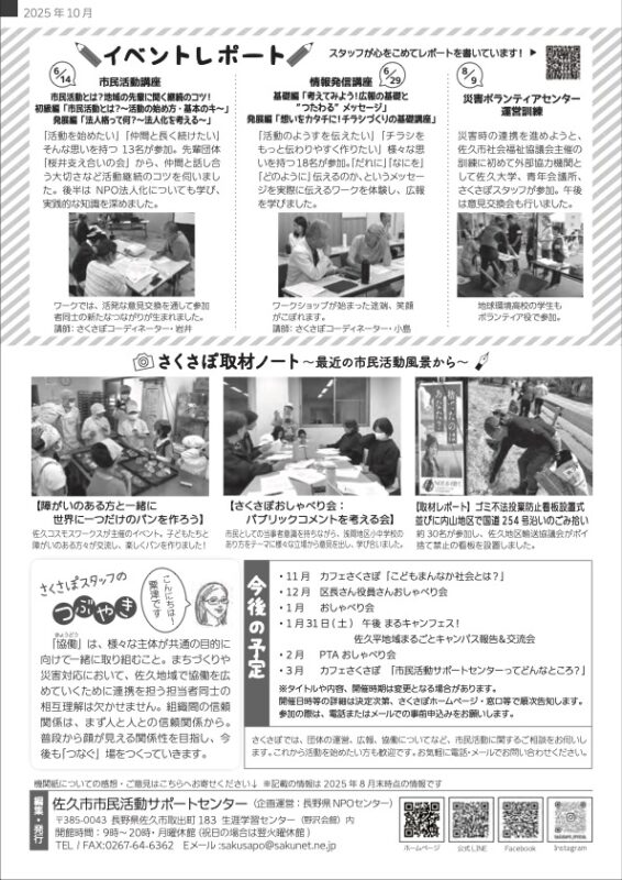 機関紙「さくさぽ」では、佐久市市民活動サポートセンターの様子や、イベント・講座のスケジュール、またミンカツの最前線を楽しくおまとめしております。