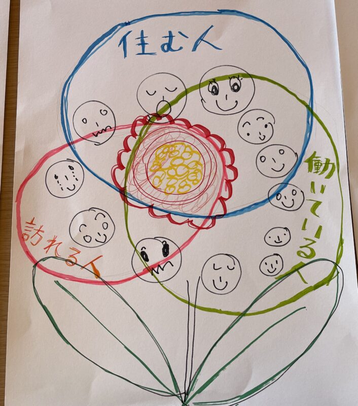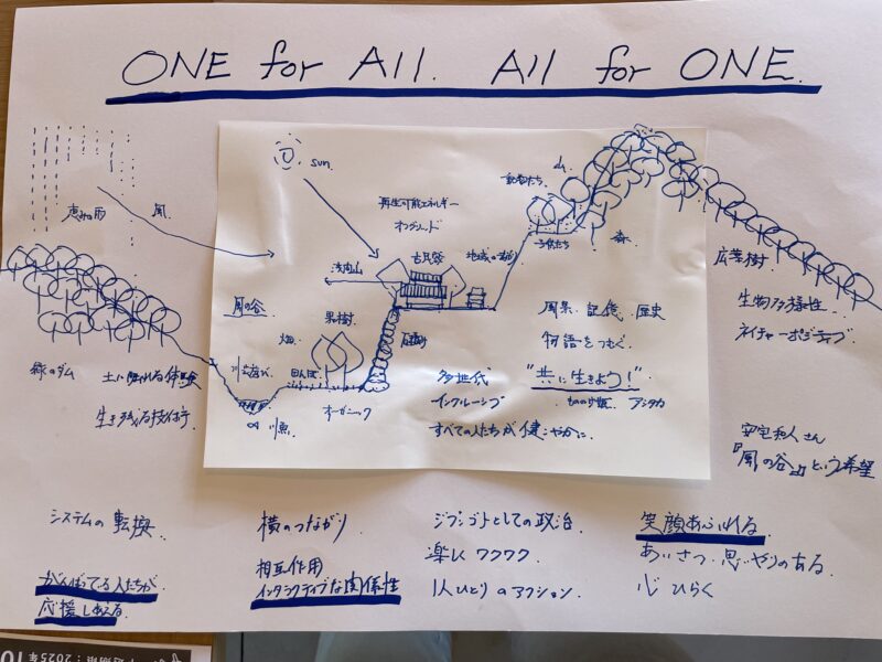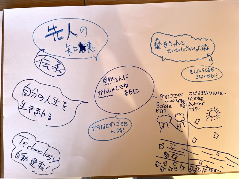 午後の部の「みらいのまちを描く」では何を大切にしたいか、どのようなまちにしたいかなどのテーマで対話の時間。小学生、中学生も交えてのグループワークは未来志向の多様な考えや情報が飛び交う楽しくも学びの多い時間でした。