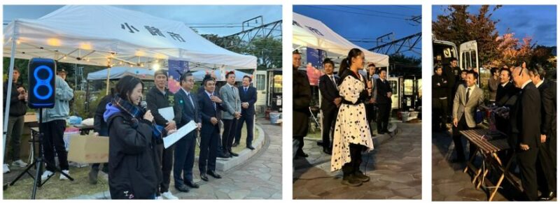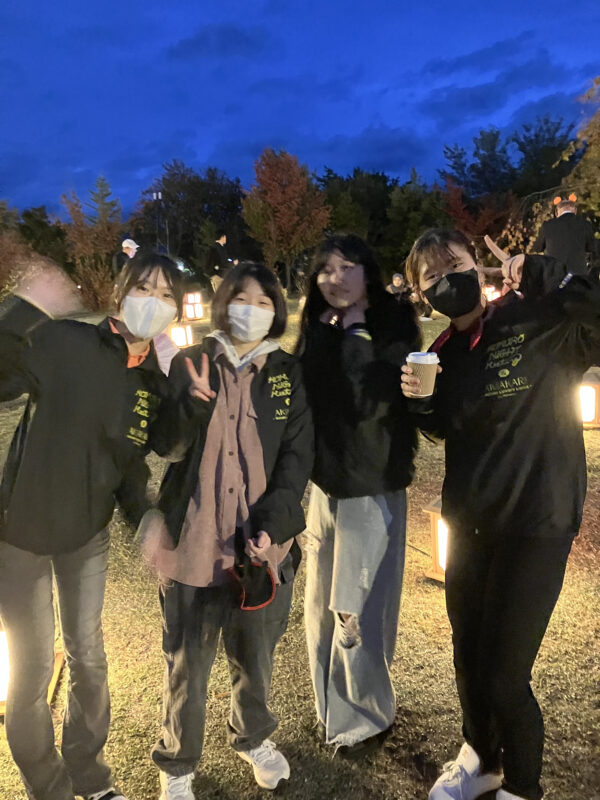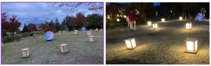 初日の17時からは点灯式が行われ、16時からは「あかり市」として飲食・クラフト品の販売も展開。ハロウィーンの時期とも重なり、近隣中学校の生徒会を中心に(生徒会のテーマ「つながる」)80名ほどの生徒が仮装ブースなどで盛り上げたり、地域の人々と来訪者がゆるやかに交流する場にもなっていました。会場には駅前、停車場ガーデン、懐古園地下連絡通路など複数のスポットが設定され、町全体が光で包まれたような一夜となりました。