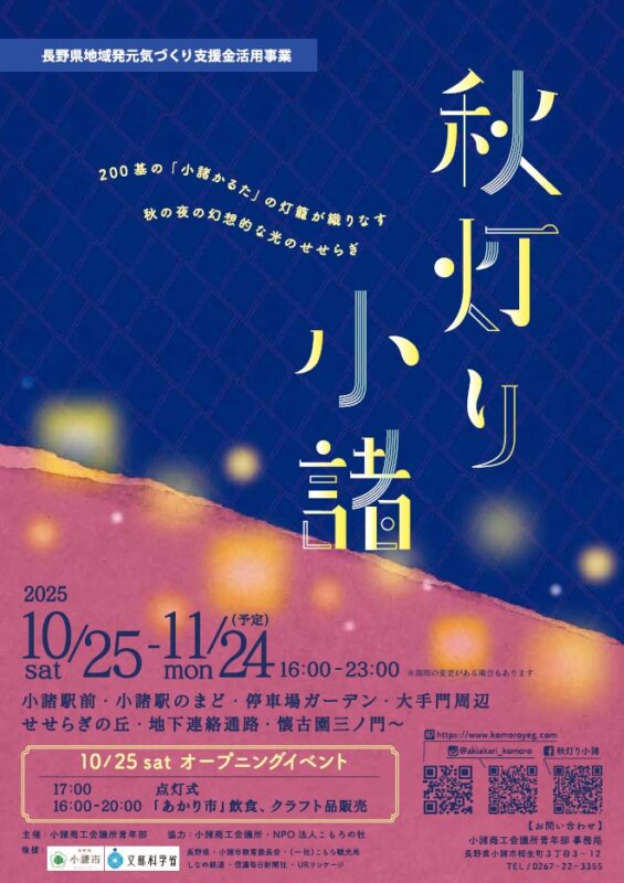 夜の散策を通じ、普段とは違う「まちの顔」が見えたことも本イベントの魅力です。日中の観光地として知られる小諸が、夕暮れから夜にかけて灯りによって別の表情を見せる──そんな時間を体験できる貴重な催しと感じました。静かで温かい光の中、訪れる人々がそれぞれのペースで「小諸」を味わう秋の夜は、まさに心に残るひとときでした。コロナ禍に始まり4回目のイベント、これからも未来を照らす灯りが続きますように。
