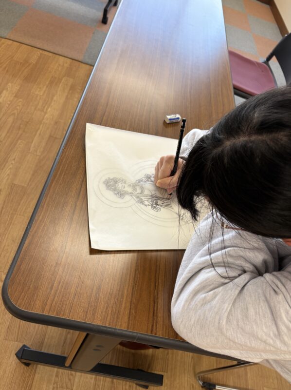 ■静寂の中での精神修養(信永院座禅の会) お香の香りが漂う空間で、写経や写仏の体験が行われました。生徒からは「写仏に挑戦しました。集中する時間は貴重な体験になりました」といった声が聞かれ、外の賑やかさとは対照的な静寂を味わっていました。