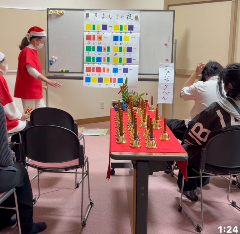 ■音でつながるミュージックベル(満月の唱会) 色分けされたベルを使い、初めての方でもすぐに演奏に参加できました。会場には美しいクリスマスソングの音色が響き渡りました。
