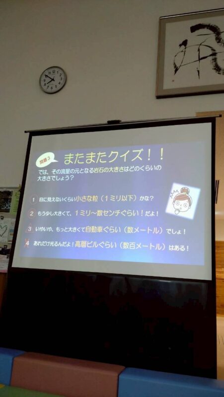 プロジェクター投影&クイズ メンバーの木次さんが用意してくれた、しし座流星群などのタイムラプス映像は圧巻。流れ星の輝きに、参加した高校生たちは身を乗り出して興味津々で見入っていました。参加した高校生たちは終始興味津々な様子で星空を見つめていました。
