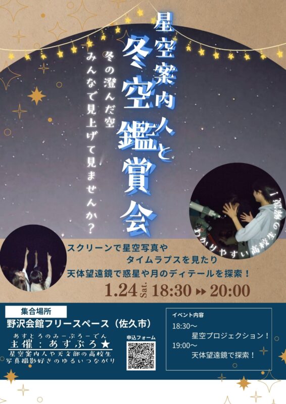 今回のイベントは、市民活動団体の、星空案内人「あすぶろ」から、さくさぽに「トライアルイベントをしてみたい」という相談からはじまりました。さくさぽが、普段から野沢会館のフリースペースを利用している高校生たちにヒアリングしたところ、星空に興味を持つ学生たちがいたため、日程調整をしたうえでイベント開催となりました。