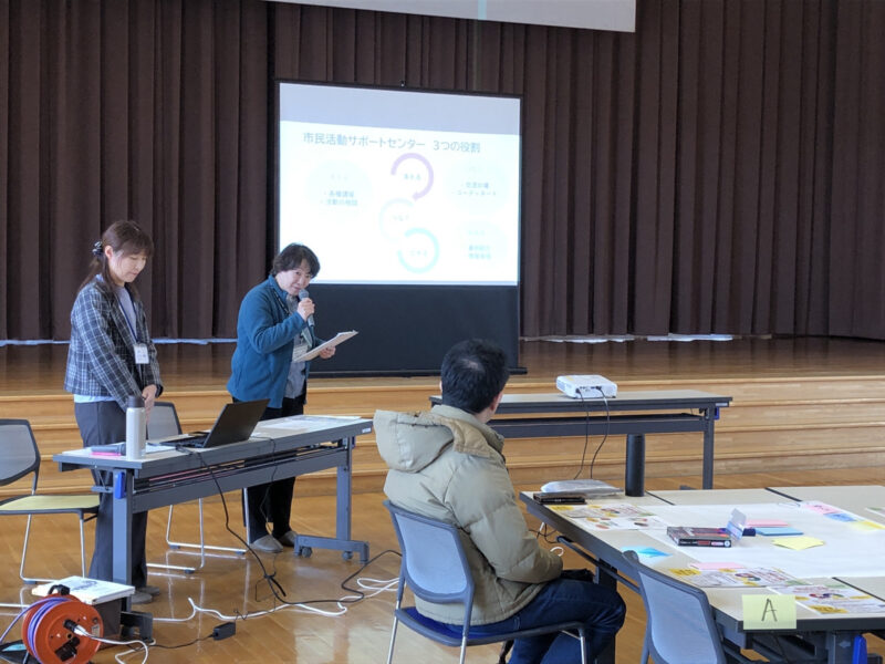 第1部では、佐久市役所広報広聴課の佐藤係長より、佐久市がさくさぽを設置している経緯や意図についてお話いただきました。加えて、さくさぽコーディネーターの佐々木より、「市民活動ってそもそもなに?」、「さくさぽの役割:支える・つなぐ・広めるの事例」、「印刷機や閲覧用PCなど、さくさぽの施設」などを紹介しました。