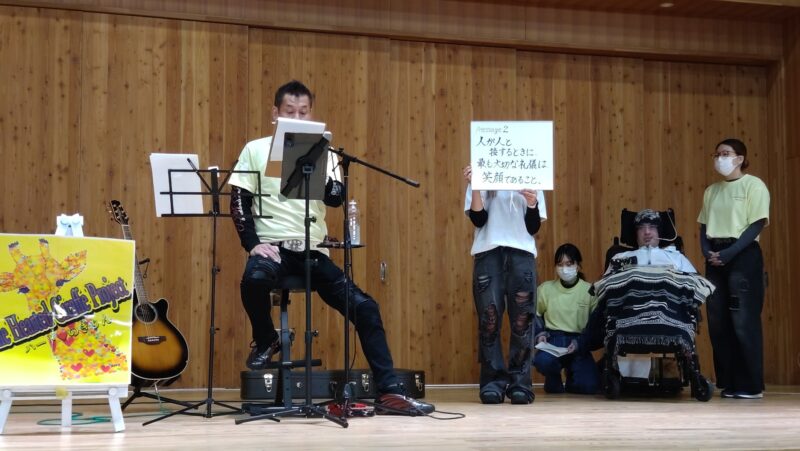 3月28日、佐久市市民活動団体ハートのキリンプロジェクトは、はっぴーフェスタとのコラボ企画として、長野県立武道館で「命のLIVE」を開催しました。元教員でALS(筋萎縮性側索硬化症)と闘う有坂先生が綴った12のメッセージを、地元音楽ユニットRE:BORNの荻原竜二さんが代読し、長渕剛の楽曲と共に届けるという、想いが共鳴するステージとなりました。
