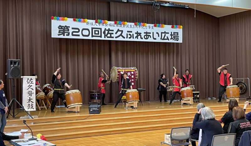 ステージ発表のオープニングは佐久聾太鼓。お手玉演舞、体操、ハープ演奏、バンド演奏、日本舞踊などが次々と登壇。