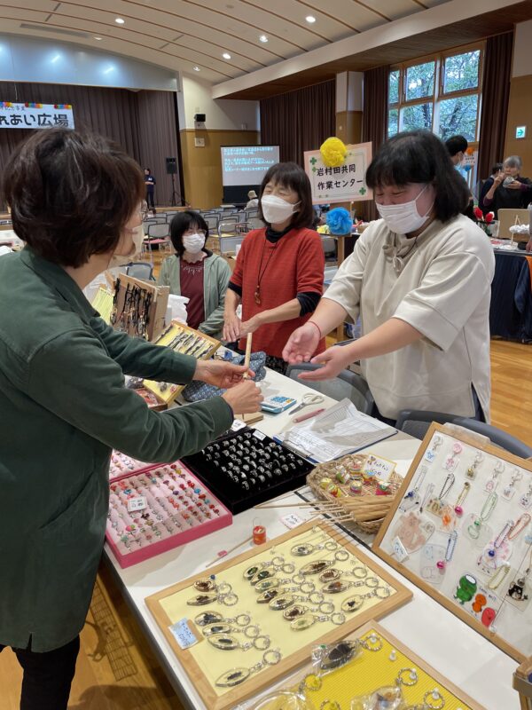販売コーナーでは、作業センターごとに特徴あるアクセサリーや布小物などハンドメイド品ががきれいに並んでいました。