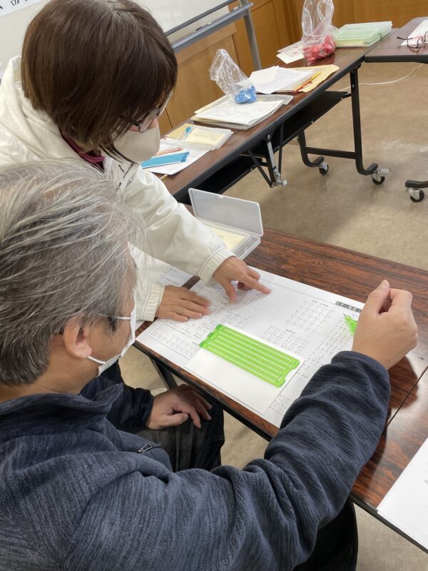 体験コーナーの点字体験では説明を聞きながら真剣に点字を打っていました。別室では、ミュージックベル、手書き紙芝居、塩分アンケート、カラーセラピー、絵手紙、お手玉など盛りだくさん。