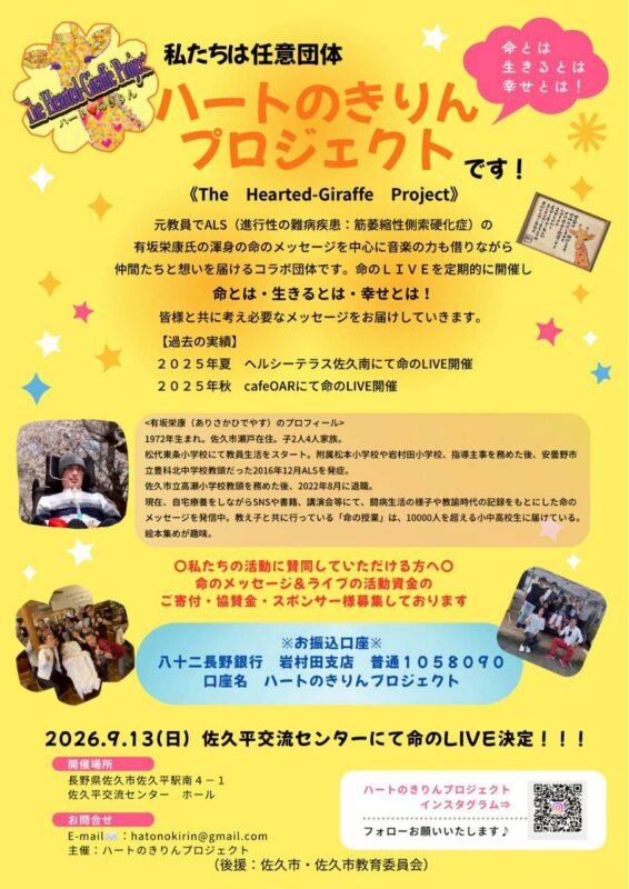 | 活動日・時間帯・頻度など | 令和8年 ①3月28日(土) 命のライブ 長野県立武道館 ②9/13(日) 命のライブ 佐久平交流センターホール ③(期日未定) 命のライブ 各種学校・施設 |