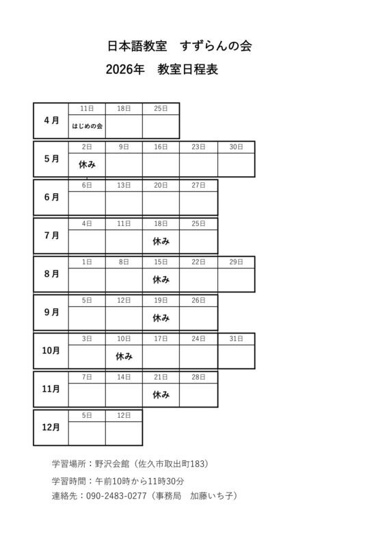 | 活動日・時間帯・頻度など | 2026年4月11日から12月12日まで 年30回開催。 日程は担当者またはfacebookの出席カードで確認してください。 |
