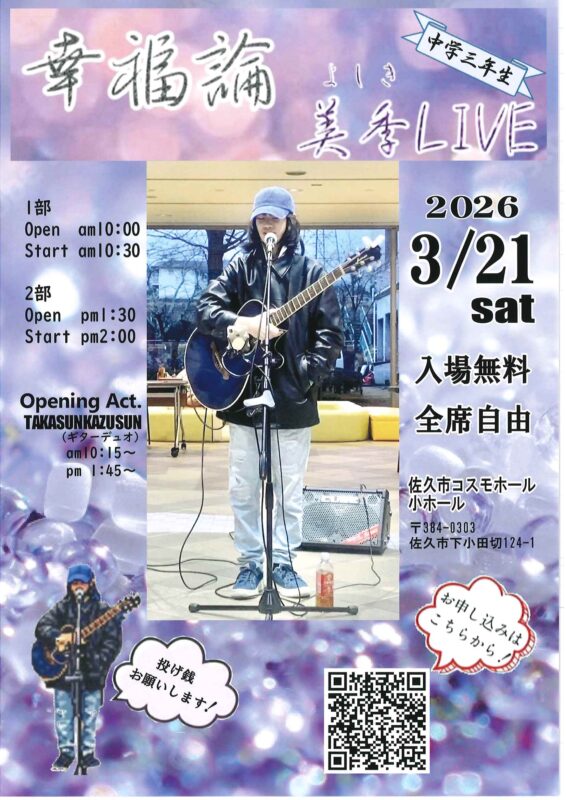 #ライブ告知#美季#幸福論#佐久市コスモホール#中学3年生#弾き語り#TAKASUNKAZUSUN#長野県佐久市