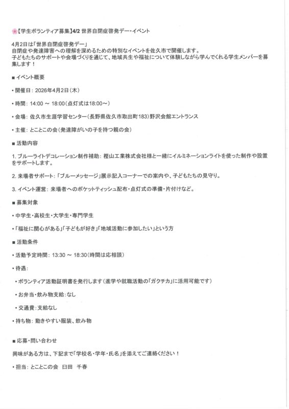 #佐久市 #福祉 #世界自閉症啓発デー #LIUB #佐久市 #長野県 #ボランティア募集 #学生ボランティア #ガクチカ #地域貢献 #とことこの会 #発達障害 #市民活動