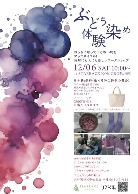 ワインの醸造過程で残る果皮や澱をアップサイクルして布や木材などをきれいな紫色に染めます