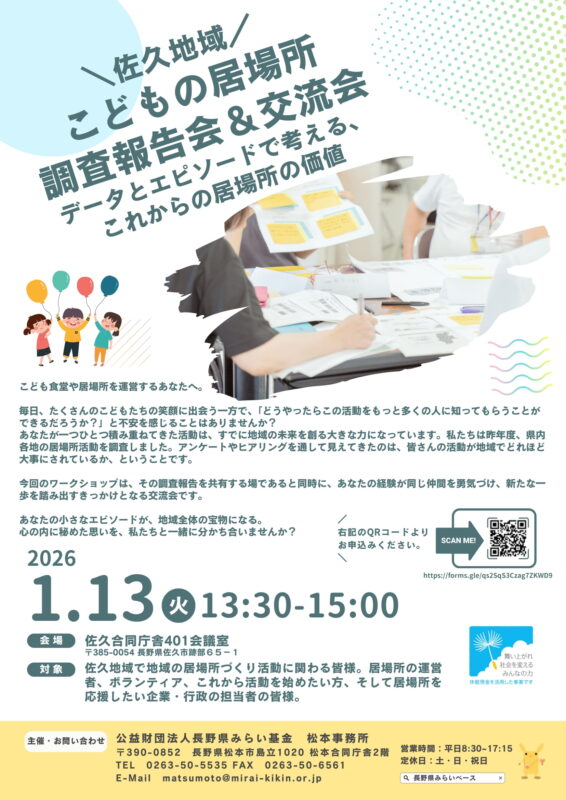 対象:佐久地域で地域の居場所づくり活動に関わる皆様。居場所の運営者、ボランティア、これから活動を始めたい方、そして居場所を応援したい企業・行政の担当者の皆様。