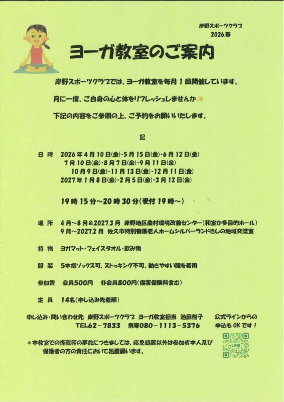 岸野スポーツクラブでは、ヨーガ教室を毎月1回開催しています。月に一度、ご自身の心と体をリフレッシュしませんか?下記の内容をご参照の上、ご予約をお願いいたします(^^)/