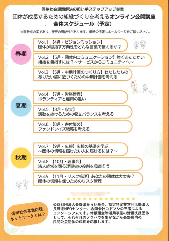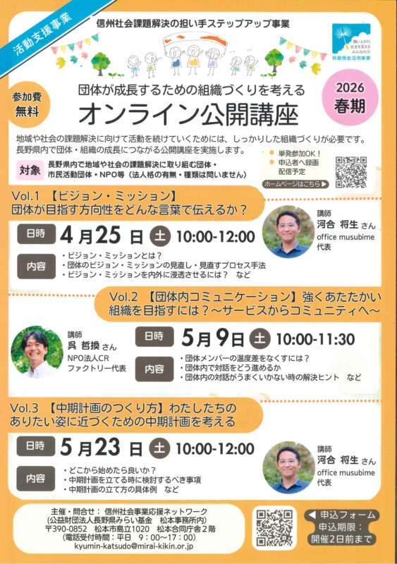 地域や社会の課題解決に向けて活動を続けていくためには、しっかりした組織づくりが必要です。長野県内で団体・組織の成長につながる公開講座を実施します。