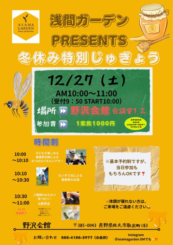【主催: 浅間ガーデン養蜂場】冬休み特別じゅぎょう