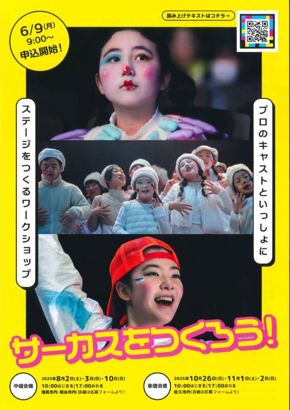10月に東信地域で開催します。3日間をかけて、みんなで得意なことを持ち寄って、プロのキャストと一緒に小さなパフォーマンスを作り、最終日にお披露目します。ここで生まれたパフォーマンスは、ホンモノの舞台「ムーンナイトサーカス」での発表につながる可能性もあります。あなたのチャレンジをお待ちしています。