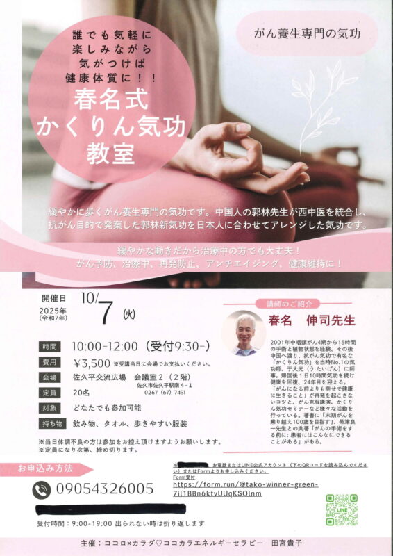 講師の春名伸司先生は、ご自身もステージ4のがんを克服された経験をお持ちです。その壮絶な体験を基に、統合医療の第一人者である帯津良一医師とも交流を重ねながら、心身の活力を高めることを目的として、中国の伝統的な気功を日本人に合わせてアレンジされました。