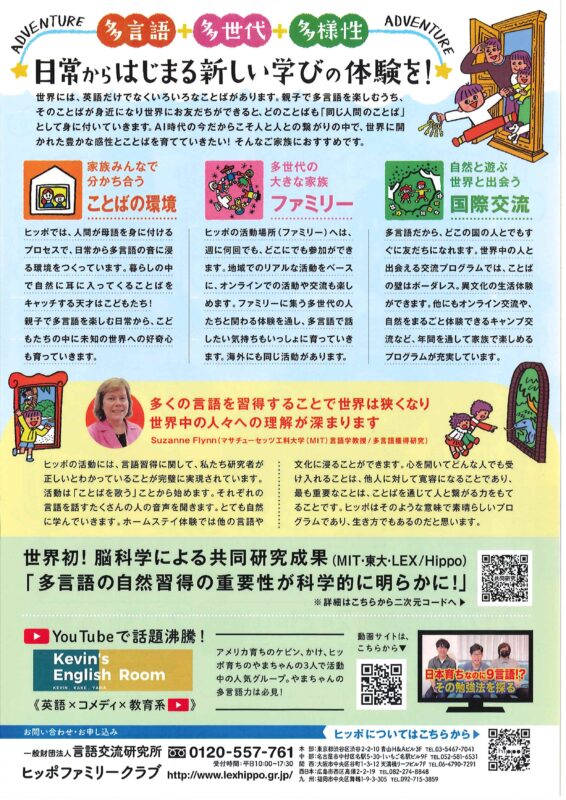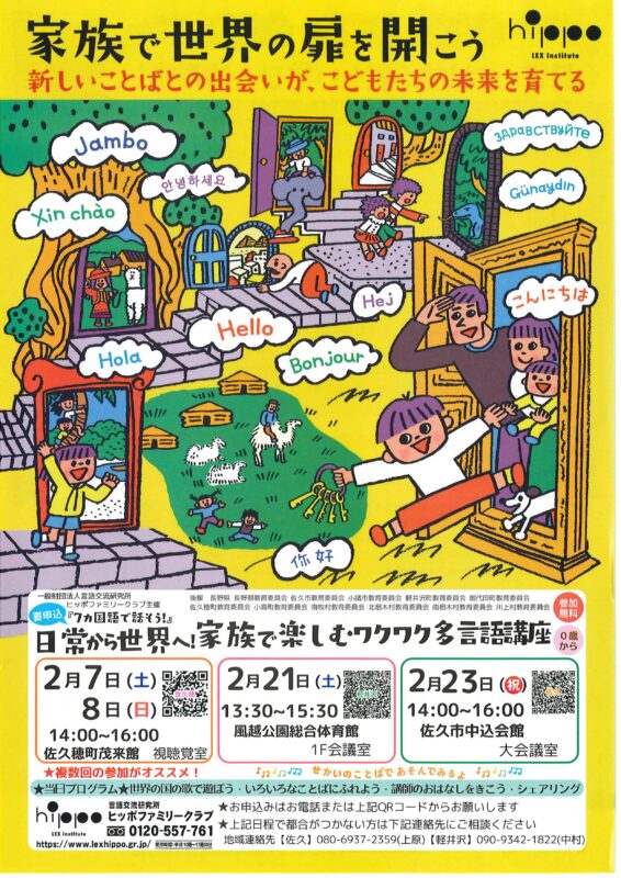一般財団法人 言語交流研究所 ヒッポファミリークラブ主催の「多言語講座」が開催されます。 赤ちゃんから大人まで、家族みんなで世界の歌や遊びを通して多言語の自然習得を体験できるイベントです。