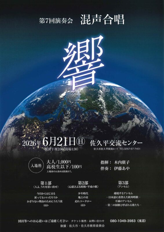 佐久市を拠点に活動する「混声合唱 響」による第7回演奏会が開催されます。昭和・平成の名曲から欧州唱歌まで、心に響くハーモニーをぜひ会場でお楽しみください 。