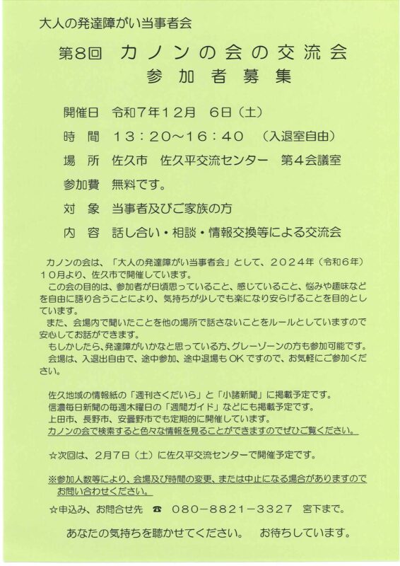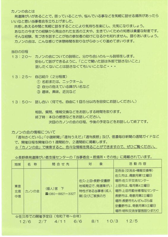 カノンの会は、「大人の発達障がい当事者会」として、2024年(令和6年)10月より、佐久市で開催しています。この会の目的は、参加者が日頃思っていること、感じていること、悩みや趣味などを自由に語り合うことにより、 気持ちが少しでも楽になり安らげることを目的としています。